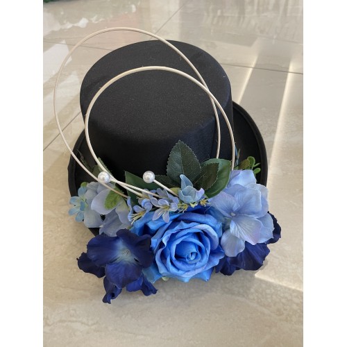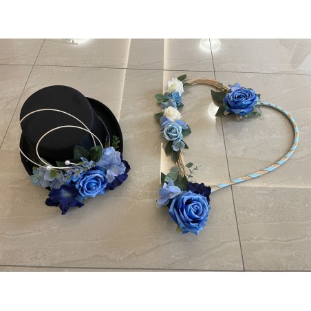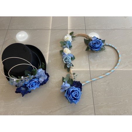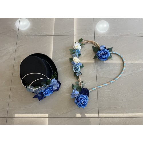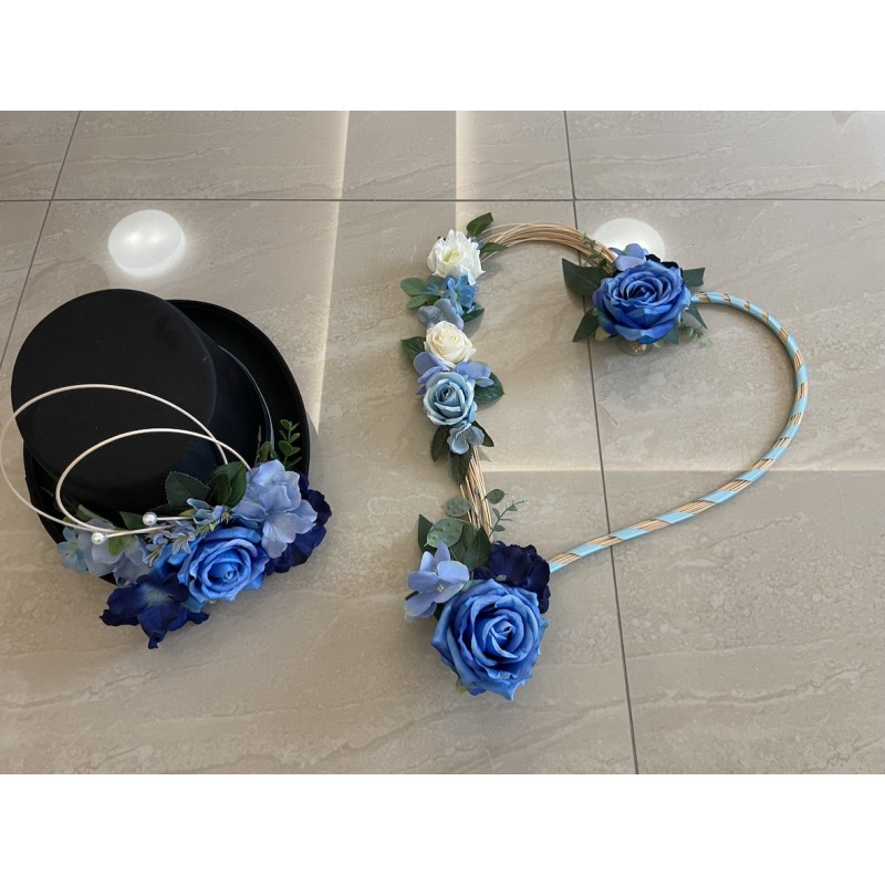 Svatební dekorace aut v tmavě modré barvě. 1x srdce a 1x cylindr. Obě dekorace včetně přísavek.