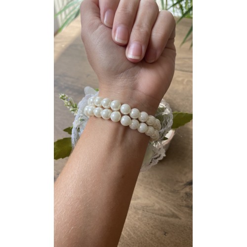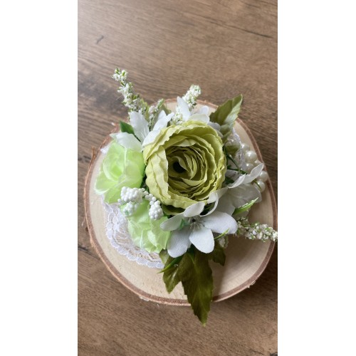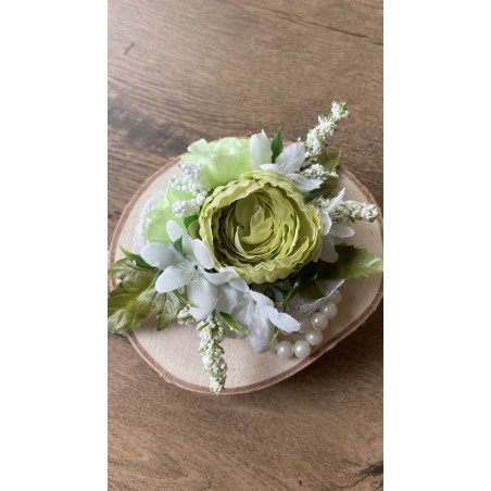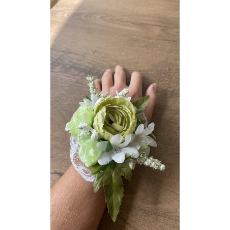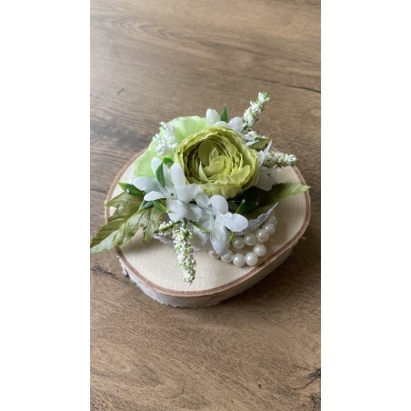 Květinový náramek v zelenkavé barvě s bílými květy.