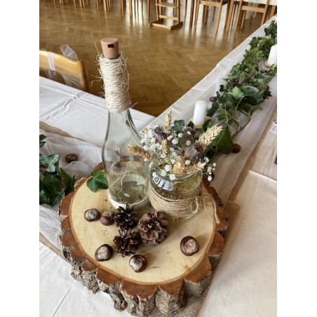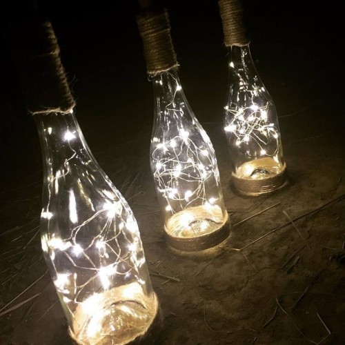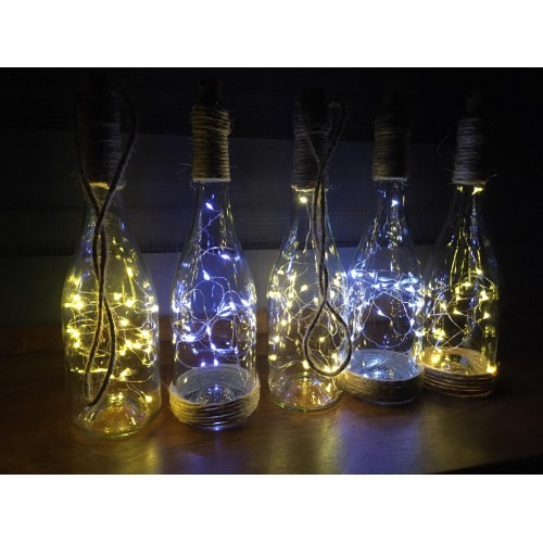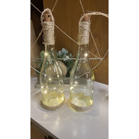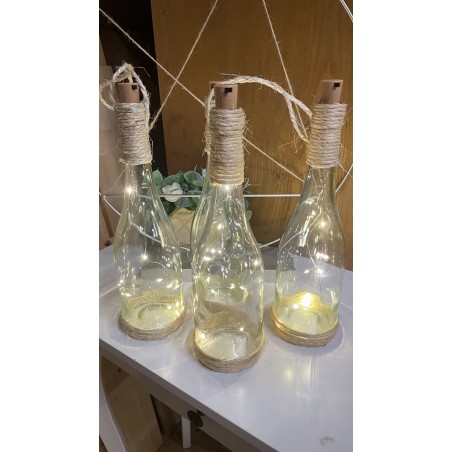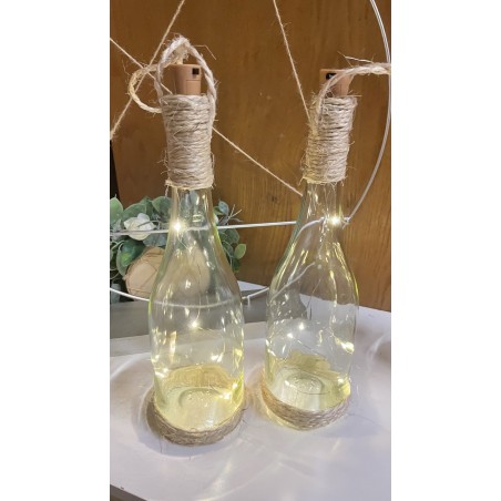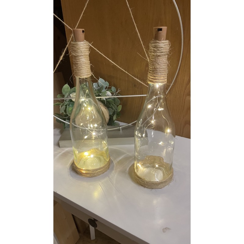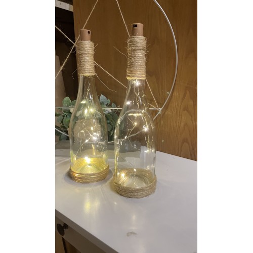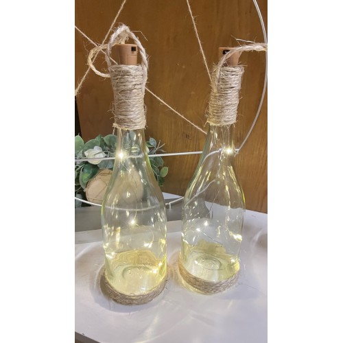 Svítící lahve omotané jutou, dvě varianty. K položení a zavěšení. Výška lahve 32 cm. Dvě varianty světýlek teplá a studená bílá. K zapůjčení včetně baterií.